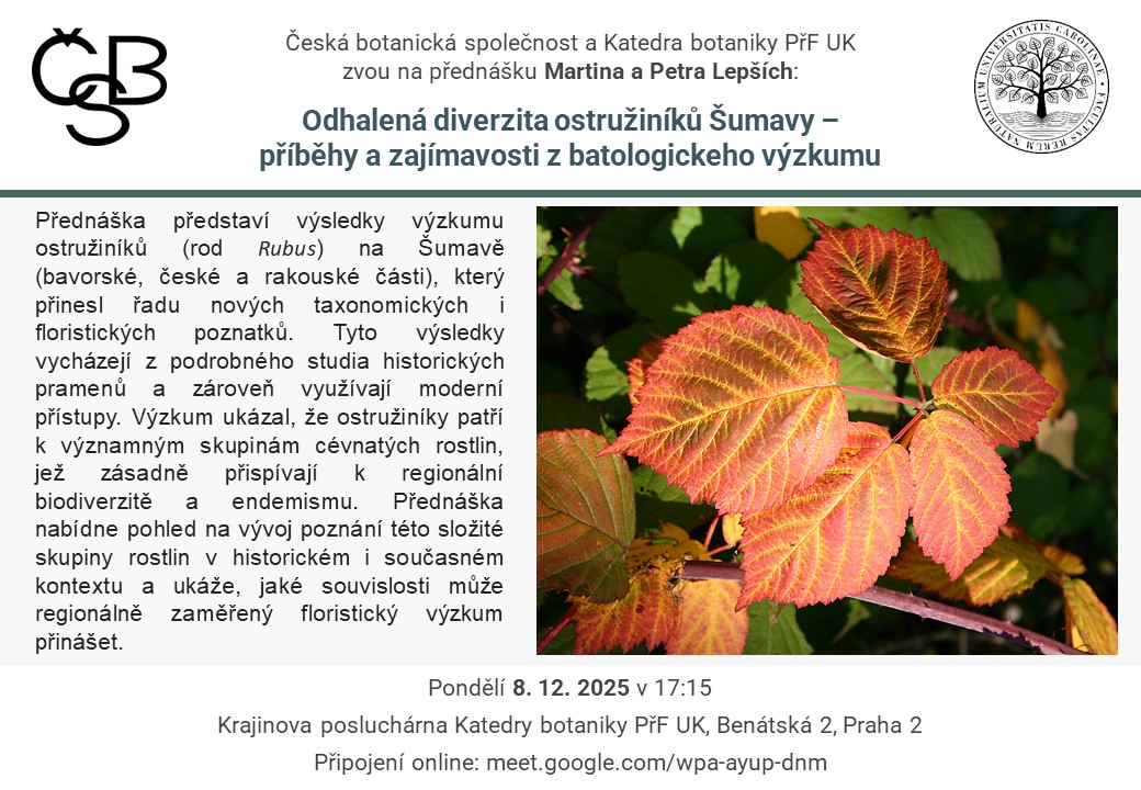 Martin a Petr Lepší přednesou přednášku na téma “Odhalená diverzita ostružiníků Šumavy. Příběhy a zajímavosti z batologickeho výzkumu.” dne 8. 12. 2025 v Krajinově posluchárně od 17.15.