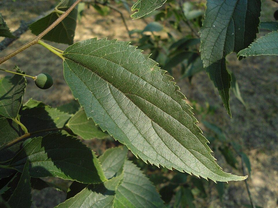 b Listy na rubu šedozelené, souvisle hustě chlupaté, na líci tmavozelené, krátce chlupaté, drsné, nelesklé; peckovice za zralosti tmavě fialové s šedavým ojíněním, plodní stopka 2–3 cm dlouhá; borka do vysokého věku hladká, ve stáří někdy bradavčitě hrbolatá – C. australis, b. jižní
